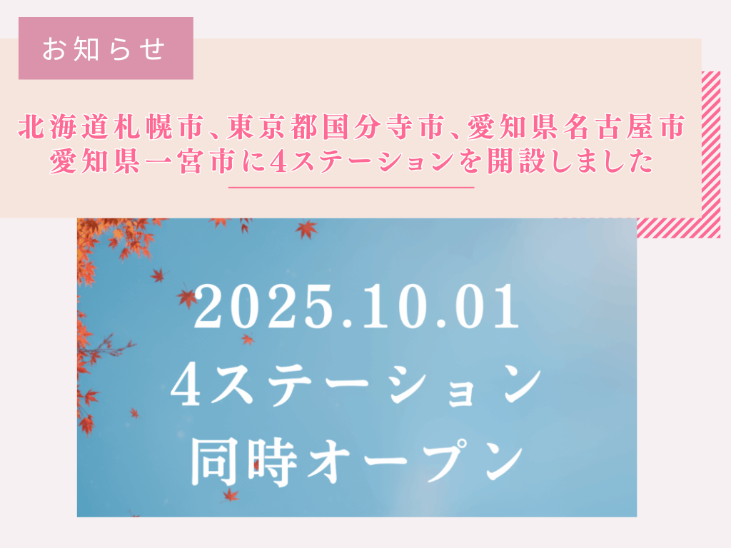 北海道札幌市、東京都国分寺市、愛知県名古屋市、愛知県一宮市に4ステーションを開設しました