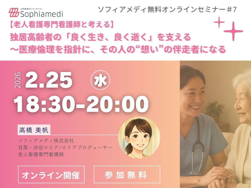 【ソフィアメディ無料セミナー第7講】2月25日(水)18:30~/【老人看護専門看護師と考える】独居高齢者の「良く生き、良く逝く」を支える ~医療倫理を指針に、その人の“想い”の伴走者になる