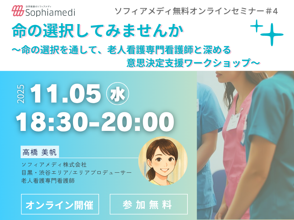 【ソフィアメディ無料セミナー第4講】11月5日(木)18:30~/命の選択してみませんか~命の選択を通して、老人看護専門看護師と深める意思決定支援ワークショップ~