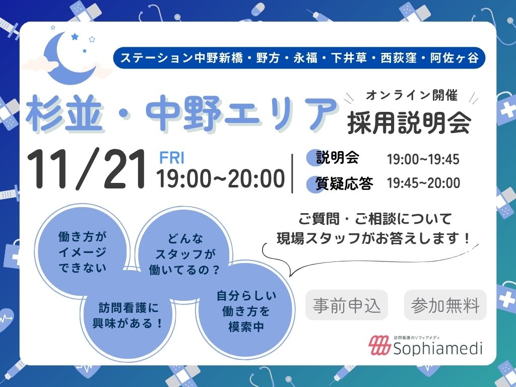 この度、杉並・中野エリアでのソフィアメディの働き方に興味をお持ちの方々に向け、オンライン採用説明会を開催いたします!この機会にぜひお気軽にご参加いただき、私たちの現場や働き方について知っていただければ幸いです。