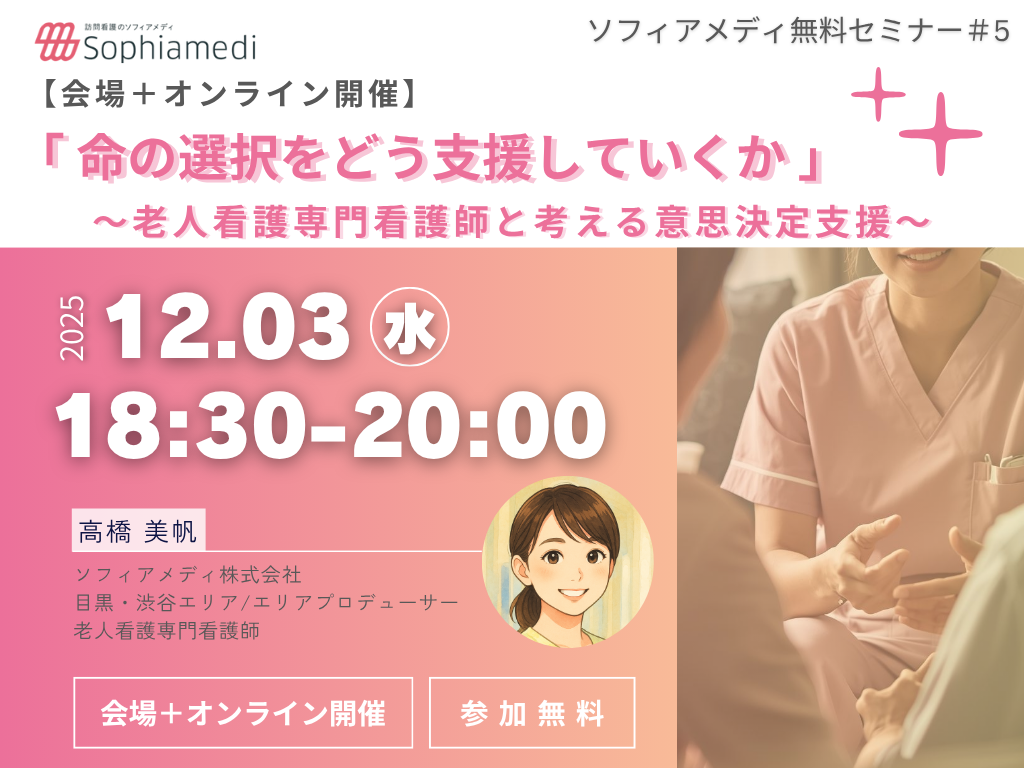 【ソフィアメディ無料セミナー第5講】12月3日(水)18:30~/老人看護専門看護師と深める意思決定支援 「命の選択をどう支援していくか」