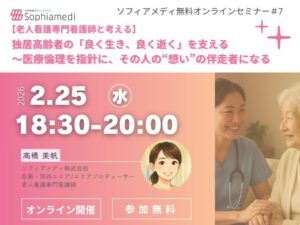 本セミナーは、老人看護専門看護師の視点を通じ、ご本人の意思決定を支えるプロセスや、多職種連携における具体的なアプローチについて深掘りします。日々の訪問の中で抱く葛藤や迷いを独りで抱え込まず、チームで紐解いていくための視点を共に養い、これからの支援のあり方をじっくりと検討する90分です。