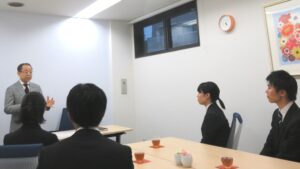 内定式では水谷社長より、歓迎の意を表するとともに経営理念に込めた思いをお話しました。人事部長からは、働く上で大切な軸を持って欲しいというお話、教育・研修事業部長からは先輩社員が行った取り組みの紹介がされました。真剣な面持ちで、時折頷きながら話を聞いていた内定者の皆さん。それぞれの心に響くお話だったのではないでしょうか。